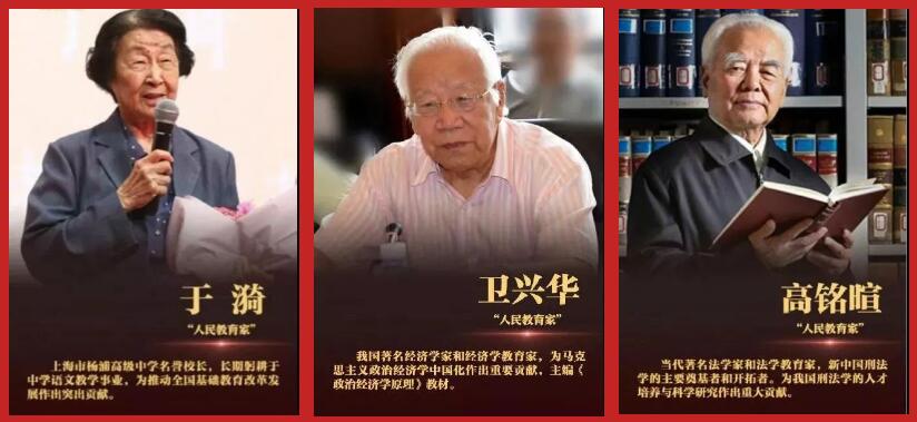“授予國家勛章和國家榮譽稱號,是對作出突出貢獻的杰出人士授予的國家最高榮譽。”于漪、高銘暄、衛興華被授予“人民教育家”國家榮譽稱號。