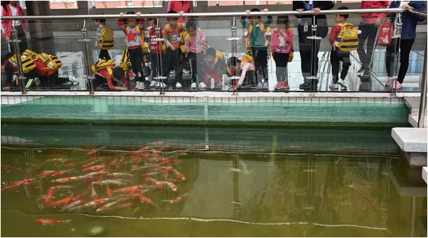 走在玻璃棧道上,孩子們膽怯又好奇,小心翼翼地走著,興致勃勃地看著,當(dāng)看到玻璃下結(jié)隊(duì)的鯉魚時,孩子們激動不已,紛紛趴下來觀看。