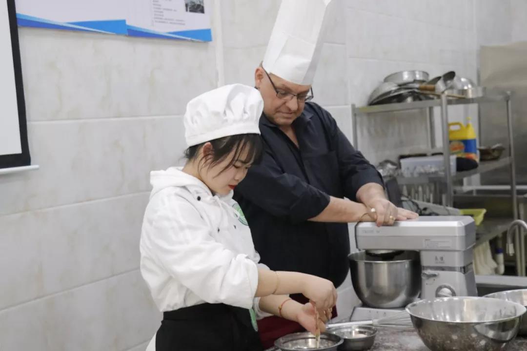 午后,Mr.Stuart一行觀摩烹飪班的面點實訓課,Mr.Stuart興起,決定寓情于教,穿上烹飪專業圍裙,帶上廚帽,要親自教授18烹飪1的同學制作巧克力曲奇。EHI 校長親授,這群孩子有福。