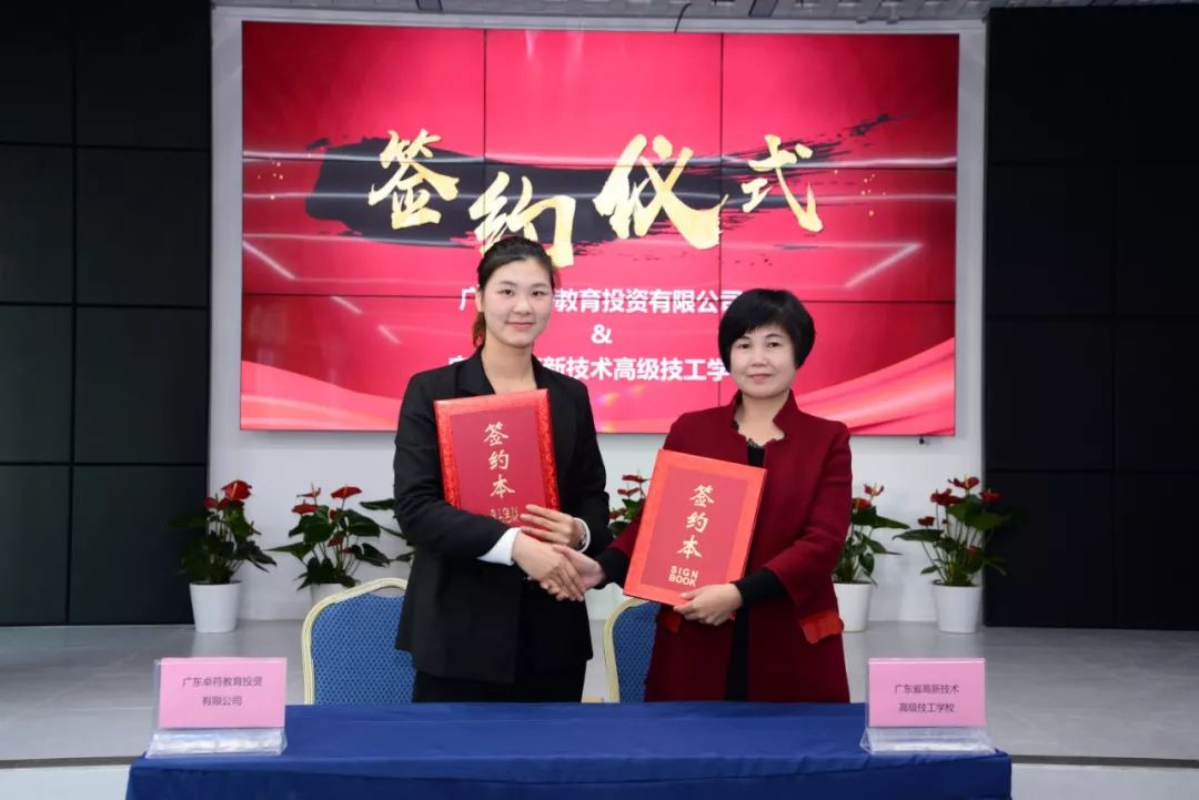 廣東卓符教育投資有限公司蓓蕾實(shí)驗(yàn)幼兒園園領(lǐng)導(dǎo)游堯與廣東省高新技術(shù)高級(jí)技工學(xué)校執(zhí)行校長(zhǎng)肖中圓簽定合作協(xié)議。