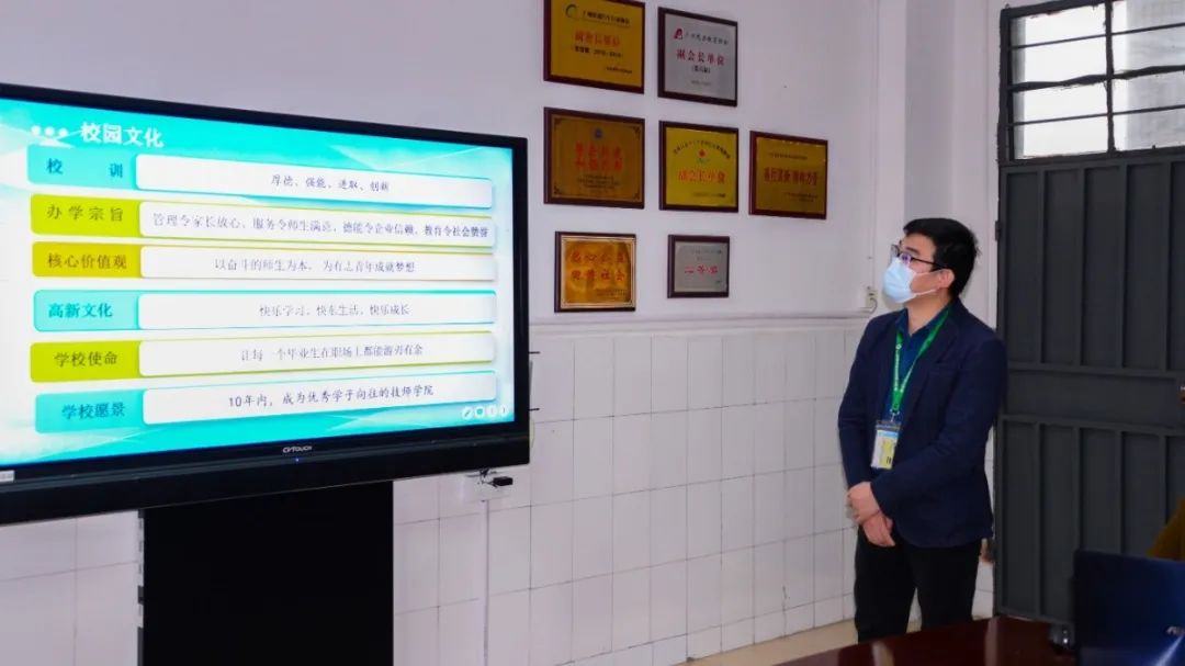 王磊校長助理介紹學校開設18個熱門專業、培養符合企業需求的專業人才等方面的現狀。王忠月副校長介紹高新升學部從今年春季開始招生,提供多元化升學途徑,幫助學子圓大學本科夢。