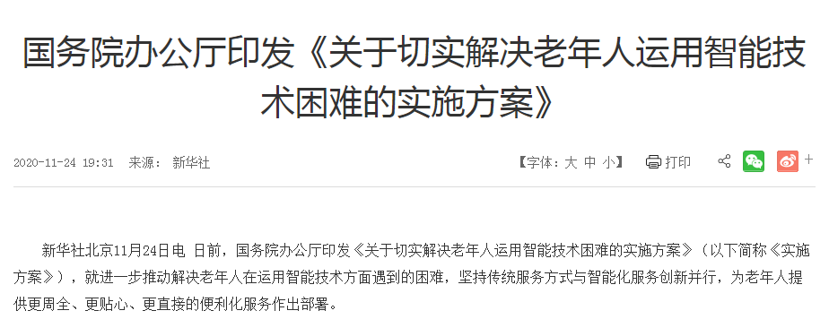 11月24日,國務院辦公廳印發了《關于切實解決老年人運用智能技術困難實施方案》的通知,要求各類日常生活場景中,必須保留老年人熟悉的傳統服務方式。